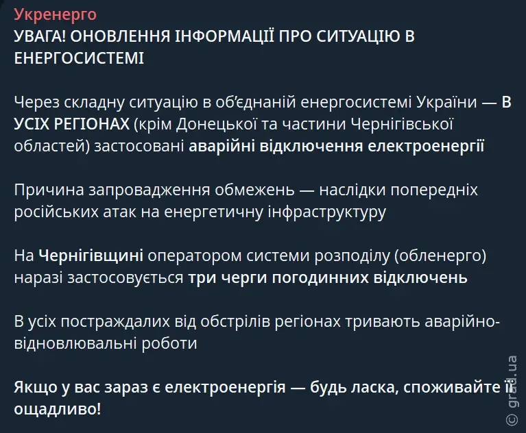 Обмеження подачі електроенергії виконуватиметься згідно з розпорядженням Укренерго: