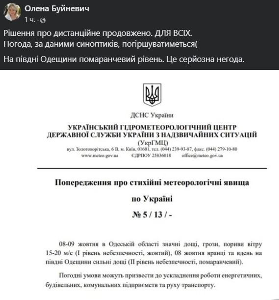У зв'язку з погіршенням погодних умов в Одесі та області, школярі 8 та 9 жовтня навчатимуться дистанційно. Про це повідомила голова Департаменту освіти та науки Одеської міської ради Олена Буйневич на своїй сторінці у Facebook.