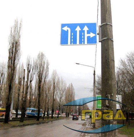 На перекрестке улиц И. Рабина и Г. Петрова с целью минимизации маневров и снижения аварийности установлен дорожный знак 5.16 «Направления движения по полосам».