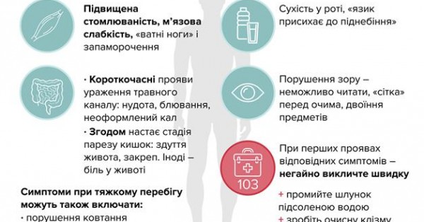 Ботулизм - тяжёлое токсикоинфекционное заболевание, характеризующееся поражением нервной системы, преимущественно продолговатого и спинного мозга. Инкубационный период может длится от нескольких часов до 10 дней. У человека появляется понос, рвота, незначительно повышается температура, начинает болеть живот. Дополнительными симптомами могут быть двоение в глазах, помутнение и опущение век, невнятность речи, затруднение глотания или сухость во рту, а также мышечная слабость. Симптомы ботулизма у детей – апатия, отказ от еды, длительный плач, а также мышечная слабость. Кроме сыворотки, ничто не связывает поступивший в кровь токсин. Летальность без сыворотки при тяжелых формах заболевания – два из трех, с сывороткой – один из десяти.