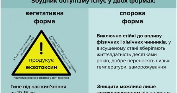 Источником заражения ботулизмом чаще всего служит рыба, которая приготовлена с нарушением санитарных правил. В основном это копченая и вяленая рыба. В Киеве продавать вяленую рыбу запретили. Также, источником заражения ботулизмом могут быть консервы домашнего приготовления: грибы и мясные консервы. Для безопасного консервирования таких продуктов необходимо применять технологию автоклавирования, при которой погибает возбудитель ботулизма.