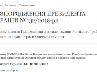 Петр Дамаскин, руководитель Ренийской районной государственной администрации, уволен с занимаемой должности. Чиновник подал в отставку по собственному желанию.Распоряжение об увольнении опубликовано на сайте Администрации президента. Документ подписан 29 августа.