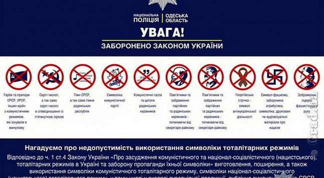 В полиции также напоминают гражданам, что в соответствии со статьей 436-1 Закона Украины «Об осуждении коммунистического и национал-социалистического (нацистского) тоталитарных режимов в Украине и запрете пропаганды их символики» запрещено изготовление, распространение, а также публичное использование символики коммунистического, национал-социалистического тоталитарных режимов, в том числе в виде сувенирной продукции, публичное исполнение гимнов союзных и автономных советских республик или их фрагментов на всей территории Украины, кроме случаев, предусмотренных законом. Указанные действия наказываются ограничением свободы на срок до пяти лет или лишением свободы на тот же срок, с конфискацией имущества или без таковой.