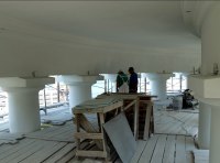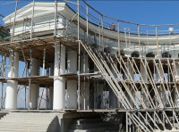 На данный момент мы уже освобождаем колоннаду от лесов в связи с тем, что закончились все работы по кровле, по потолку. Опускаемся постепенно вниз, места стыковки колонны с лесами на данный момент очищаются, шпаклюются. Когда всё будет завершено, будем заниматься благоустройством. Демонтаж лесов планируем закончить до конца следующей недели.
