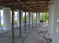 Ну, было принято решение покрыть сланцем, так как было первоначально. Использовали бетон только в одной части, заменив одну деревянную балку на бетон. Балку, которая связывает между собой все 11 пар колонн. Всё остальное восстановлено точно так, как было при графе Воронцове.