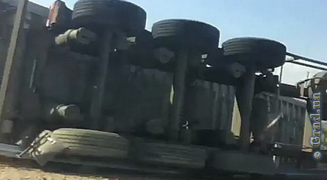 На утро 5 июля кабину грузовика вернули на проезжую часть и эвакуировали, прицеп с пустым контейнером остается лежать на боку на обочине дороги.