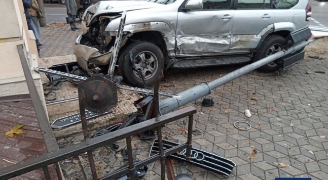 По предварительной информации, водитель автомобиля Toyota Prado двигался по улице Екатерининской в направлении Базарной, автомобиль Audi двигалась по Большой Арнаутской. На регулируемом перекрестке они столкнулись, после чего по инерции автомобиль Toyota продолжив движение, совершил наезд на светофор и врезался в ступеньки магазина.