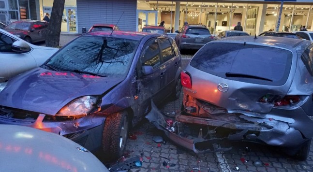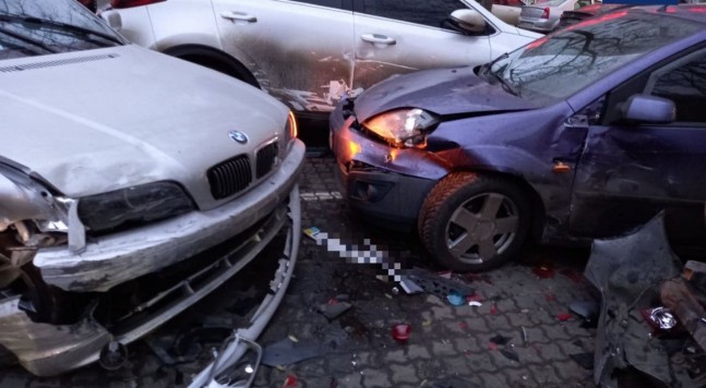 Водитель автомобиля BMW, во время выполнения разворота, не справилась с управлением машины, в результате чего выехал за пределы проезжей части. И совершил столкновение с припаркованными автомобилями Mazda, Ford и ВАЗ. Пострадавших людей нет.