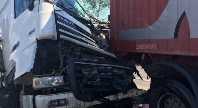 Сегодня днем водитель грузового автомобиля «DAF», двигаясь по объездной дороге, не выдержал безопасную дистанцию и совершил столкновение с грузовиком «DAF» с прицепом, который остановился впереди.