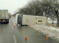 ДТП произошло сегодня утром на территории Николаевской области: на автодороге М-14 «Одесса — Николаев» перевернулся рейсовый автобус «Эталон», ехавший по маршруту «Херсон — Одесса».Автобус ехал по трассе, со стороны Николаева, в направлении Одессы. За селом Половинки, в условиях сильного гололеда, водитель не справился с управлением, автобус резко изменил траекторию движения и перевернулся, сообщает сайт «Новости N».