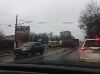 Фура перекрыла две полосы и поворот на ул.Каманина. Затруднено движение транспорта в сторону центра города. Остановлено движение трамваев 18-го маршрута.