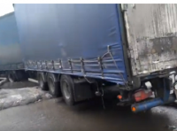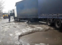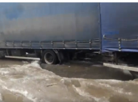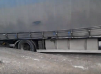 Неожиданно для водителя большегрузного грузового автомобиля закончился проезд по улице Николая Боровского.На разбитой дороге фура провалилась колесом в яму. В Интернете появилось видео происшествия. По словам очевидца, проезжая часть улицы вся в ямах, которые заполнены снегом и талой водой.