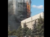Сегодня на ул.Черняховского, 4 произошел пожар в 12-этажном строящемся доме, примыкающем к торговому центру. Огонь охватил обшивку строящегося здания и добрался до крыши.