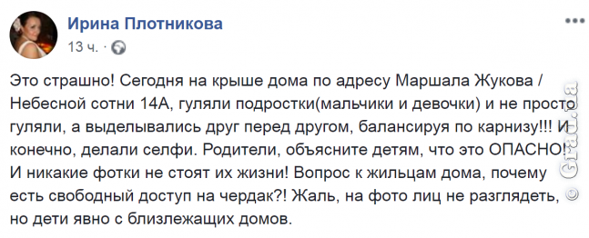 мальчики и девочки не просто гуляли, а выделывались друг перед другом, балансируя по карнизу!!! И конечно, делали селфи. Родители, объясните детям, что это ОПАСНО! И никакие фотки не стоят их жизни!
