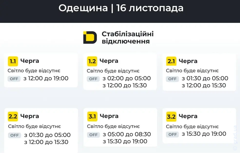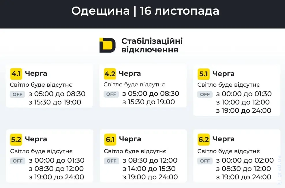 ГРАД » Отключения света, воды и газа » Отключение света в Одессе 16 ноября 2025 года